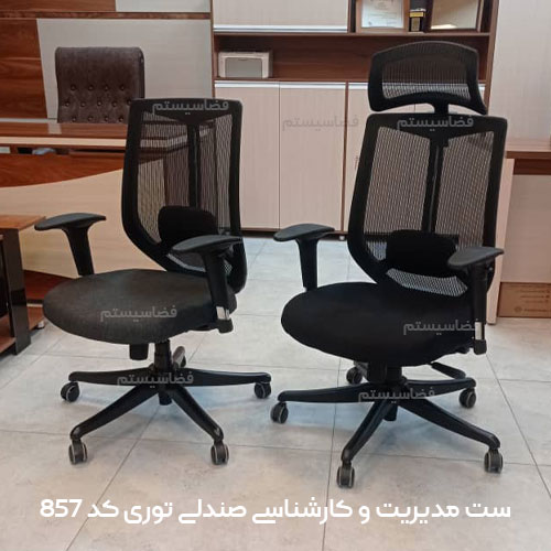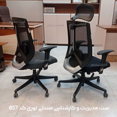 صندلی کد 857 تشکیل شده از پایه های فلزی فولادی آبکاری شده با رنگ صندلی مدیریت است که تا وزن 200 کیلوگرم مقاومت میکند و چرخ های ژله ای و نشکن که باعث میشود تا در سطوح سنگی و سرامیکی صدای خش خش در هنگاه حرکت نکند. جک 12 سانتی متر که تا وزن 150 کیلو گرم را تحمل میکند و بر روی یک مکانیزم 3 حالته قرار دارد که شما میتوانید با این مکانیزم به امکانات تنظیم ارتفاع، تنظیم پشتی و تنظیم کفی صندلی که تمام متریال از درجه 1 ترین ها با 36 ماه ضمانت باعث شده تا صندلی توری به مقاومت زیادی برسد.